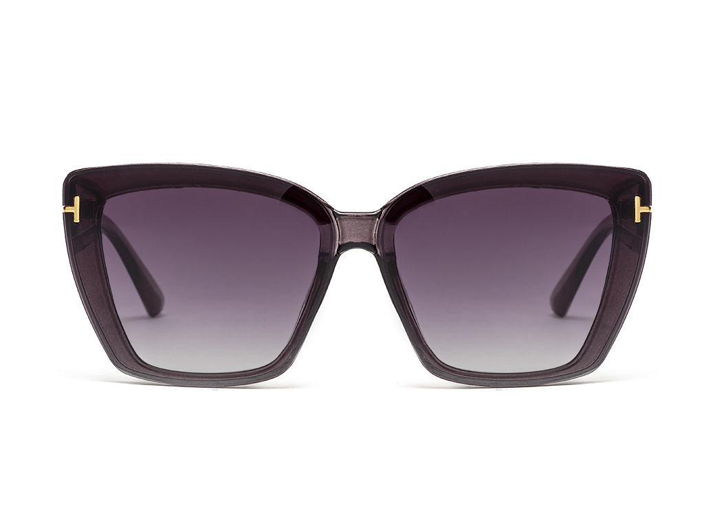 Klasyczne okulary przeciwsłoneczne w kolorze jasnoszarym z delikatnym zdobieniem na froncie oprawki.