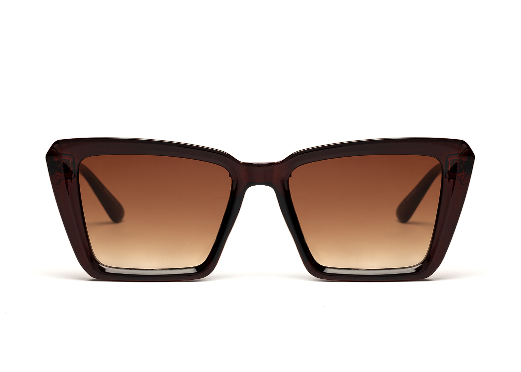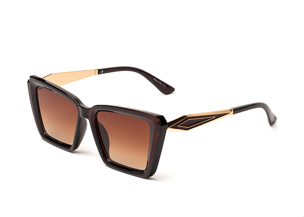 Okulary przeciwsłoneczne damskie o klasycznym fasonie.Wykonane z plastiku w kolorze brązowym ze zdobieniem metalowym na zauszniku.