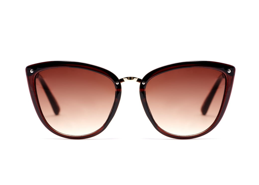 Okulary przeciwsłoneczne z polaryzacją o kształcie "kocie oko" w kolorze brązowym.Delikatny metalowy zausznik.