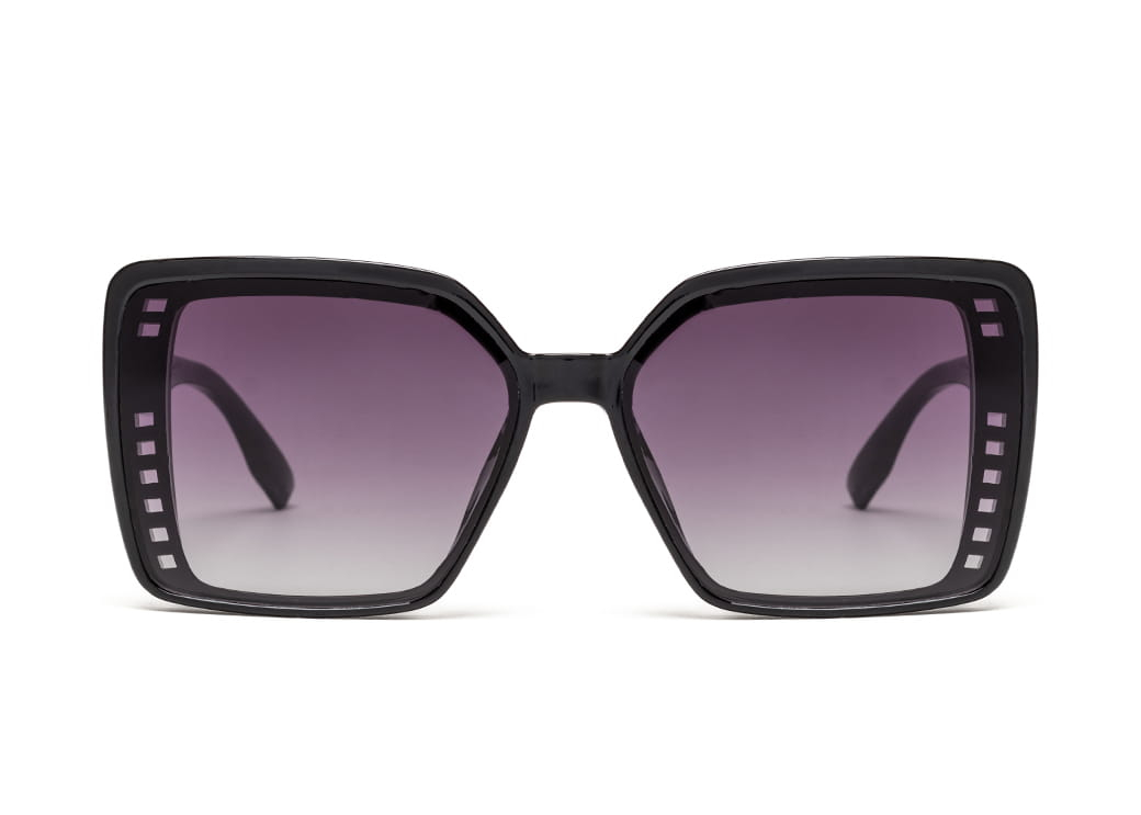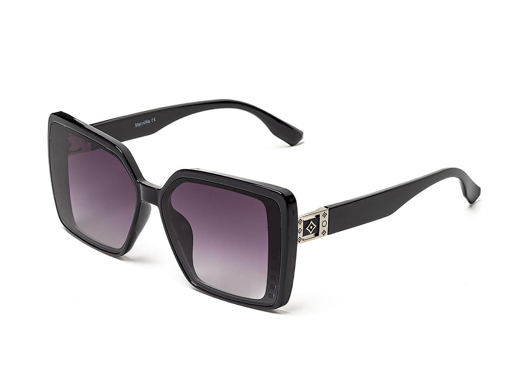 Duże,klasyczne okulary przeciwsłoneczne z polaryzacją w kolorze czarnym.Gustowny element dekoracyjny na zauszniku.