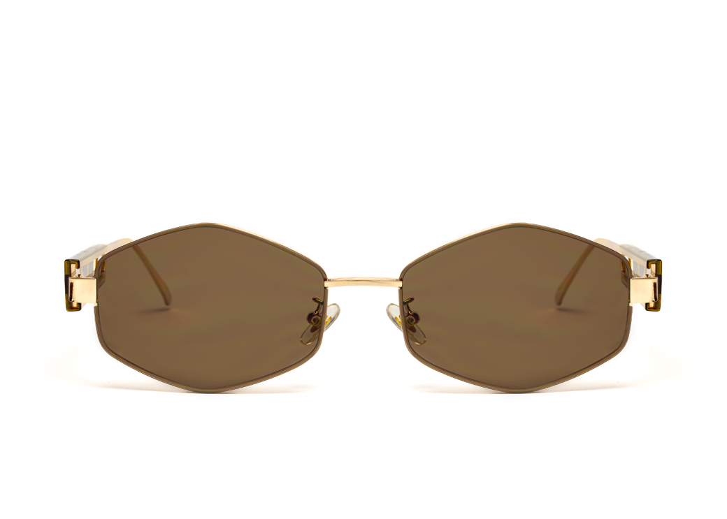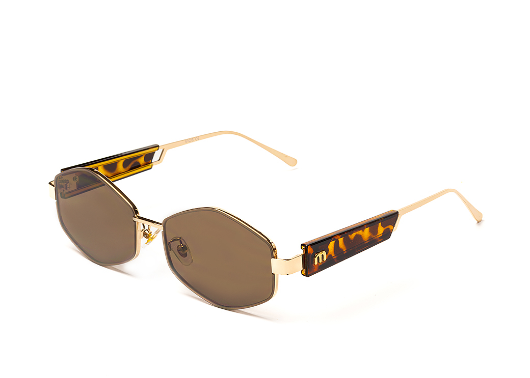 Metalowe okulary przeciwsłoneczne damskie o geometrycznem kształcie.Zausznik metalowy z elementem plastikowym w kolorze brąz panterka.