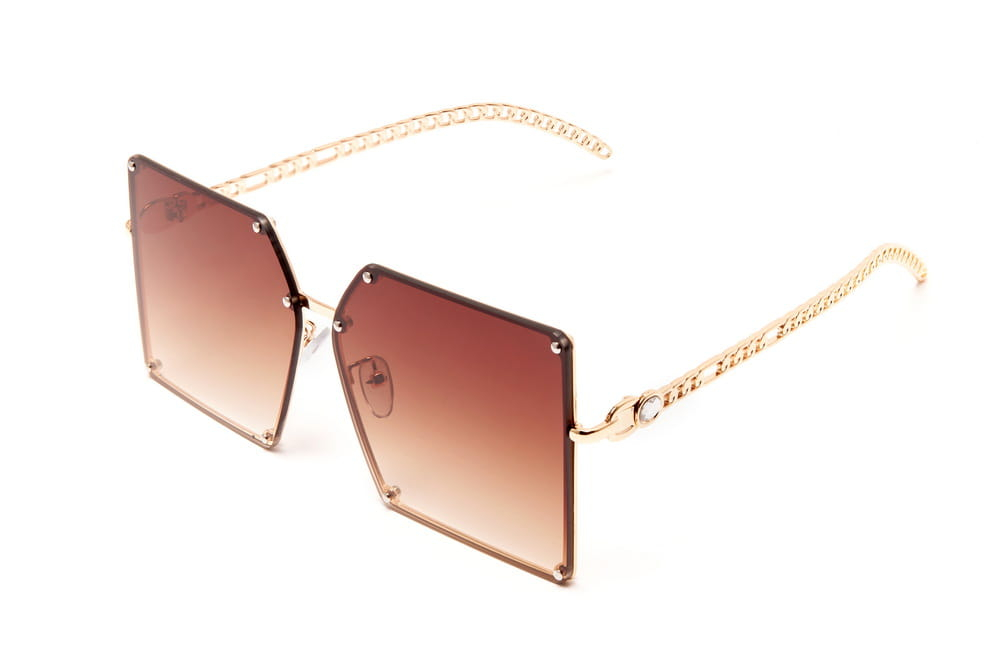 Duże,kwadratowe okulary przeciwsłoneczne, soczewka brązowa.Elegancki,metalowy zausznik.