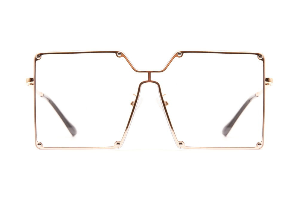 Duże,kwadratowe okulary zerówki, soczewka transparentna.Delikatny,metalowy zausznik.