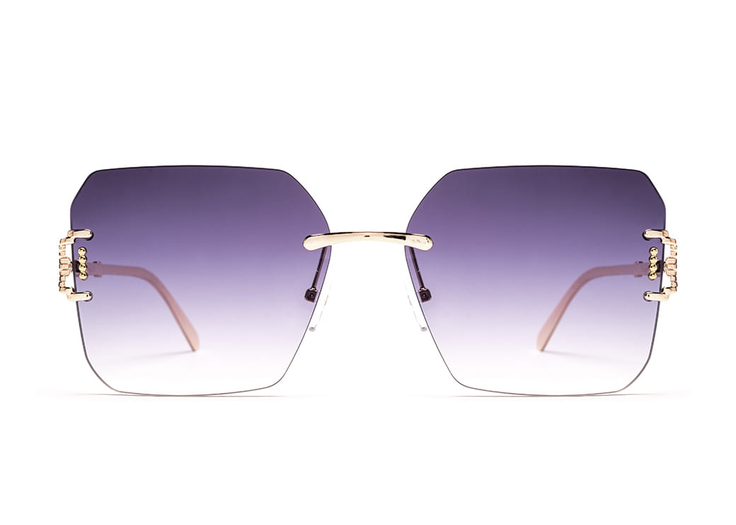 Duże,bezramkowe okulary przeciwsłoneczne, soczewka ciemnoszara.Elegancko zdobiony zausznik.