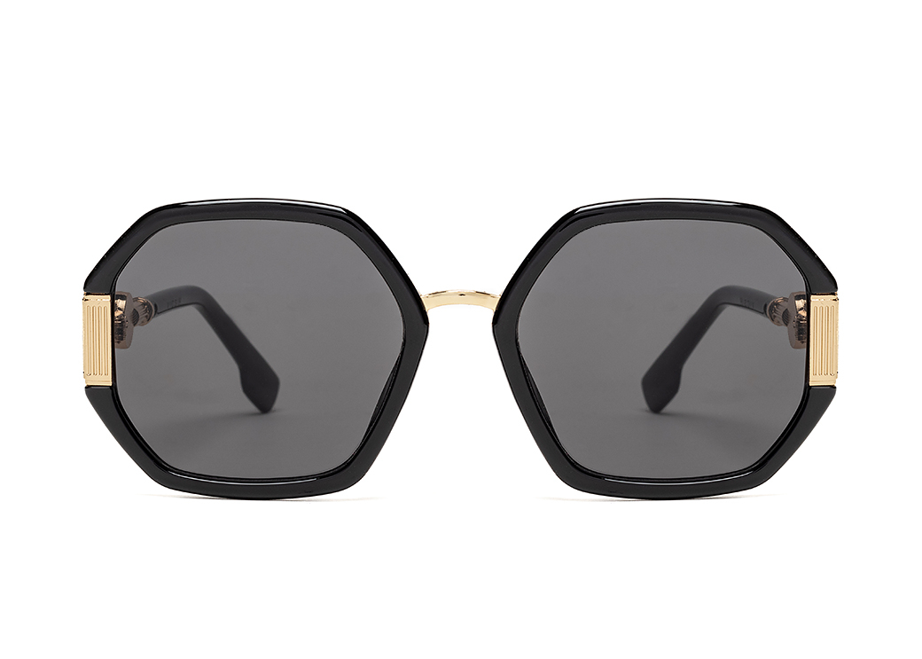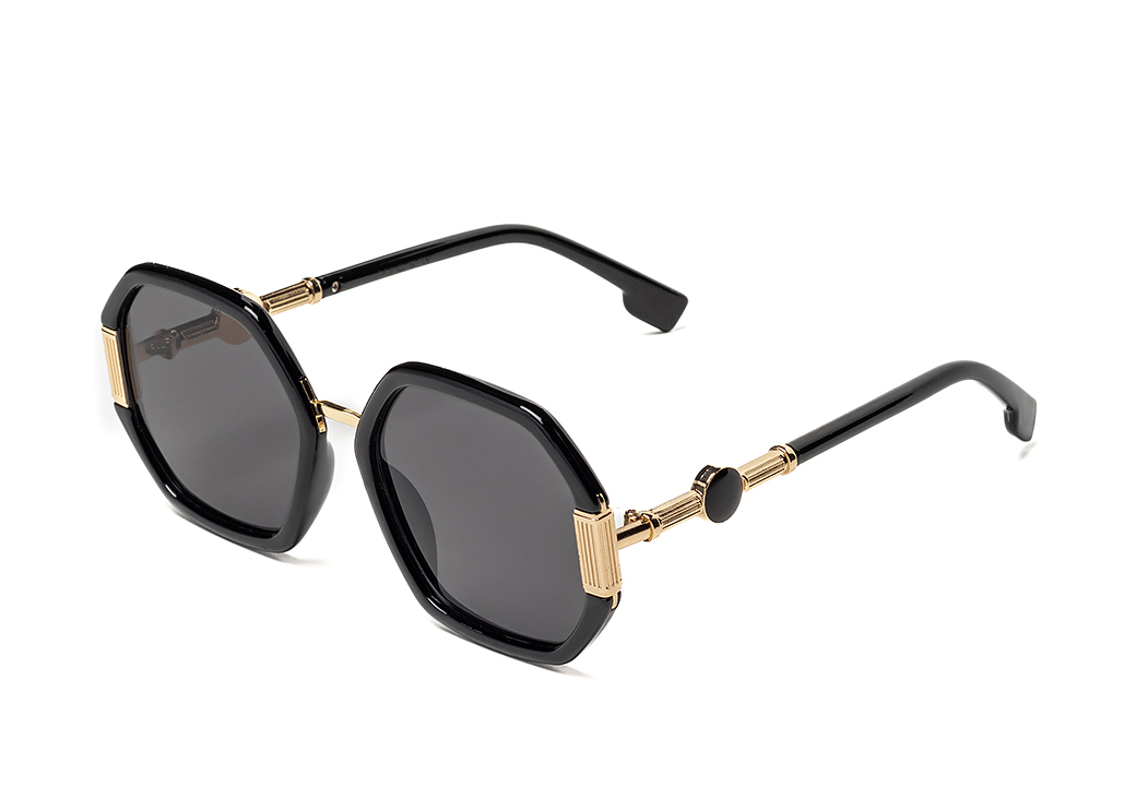Duże okulary przeciwsłoneczne o geometrycznym kształcie w kolorze czarnym.Lekkie zdobienie na froncie oprawki i zauszniku.