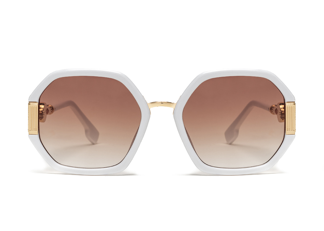 Duże okulary przeciwsłoneczne o geometrycznym kształcie w kolorze białym.Lekkie zdobienie na froncie oprawki i zauszniku.