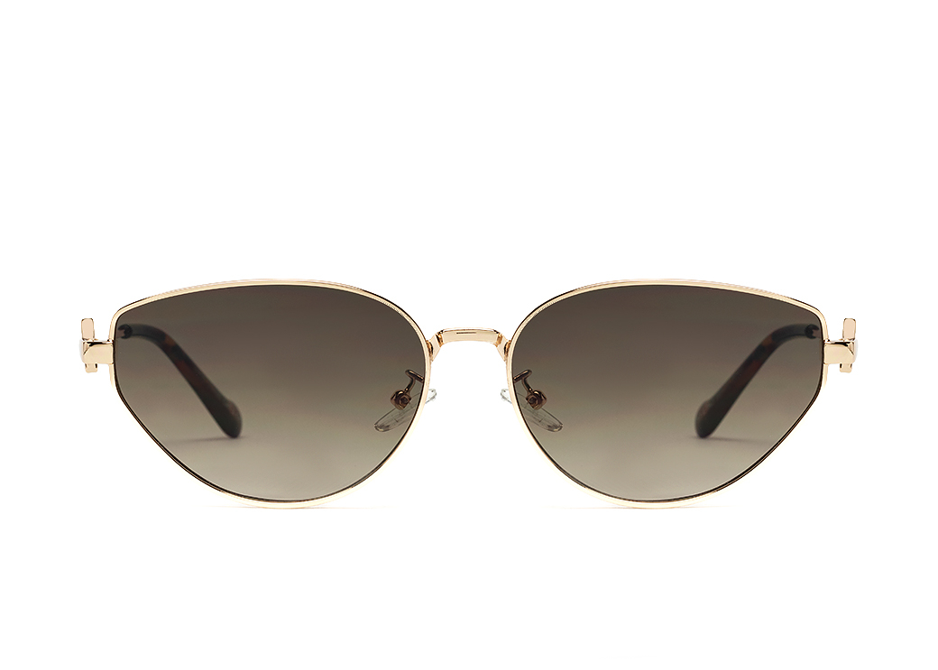 Metalowe okulary przeciwsłoneczne o nieregularnym kształcie,brązowa soczewka.Motyw dekoracyjny na zauszniku.