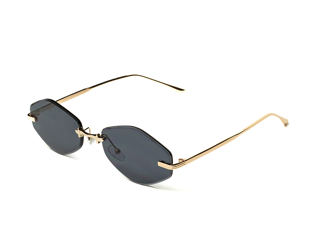 Małe bezbramkowe okulary o geometrycznym kształcie, ciemnoszara soczewka.Delikatne,metalowe zauszniki.