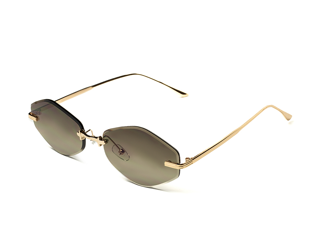 Małe bezbramkowe okulary o geometrycznym kształcie, brązowa soczewka.Delikatne,metalowe zauszniki.