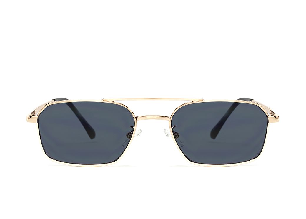 Małe okulary przeciwsłoneczne o geometrycznem kształcie,ciemnoszara soczewka.Delikatny,metalowy zausznik.