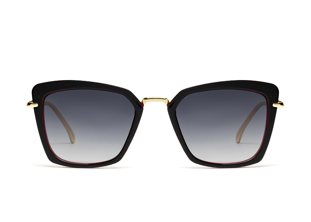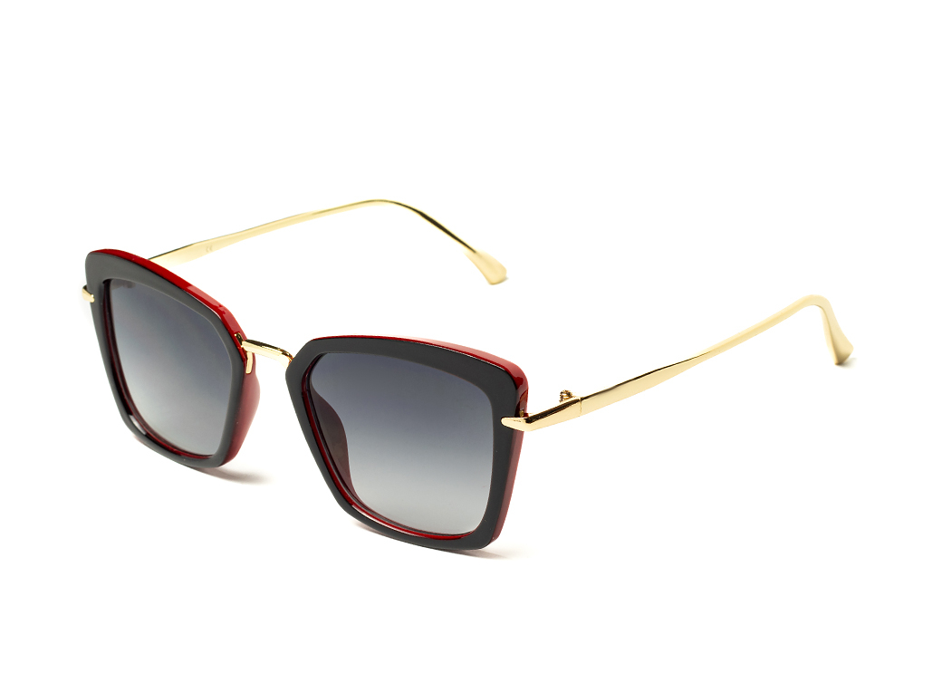 Klasyczne okulary przeciwsłoneczne w kolorze czarnym z wewnętrzną oprawką w kolorze czerwonym.Cienkie,metalowe zauszniki.